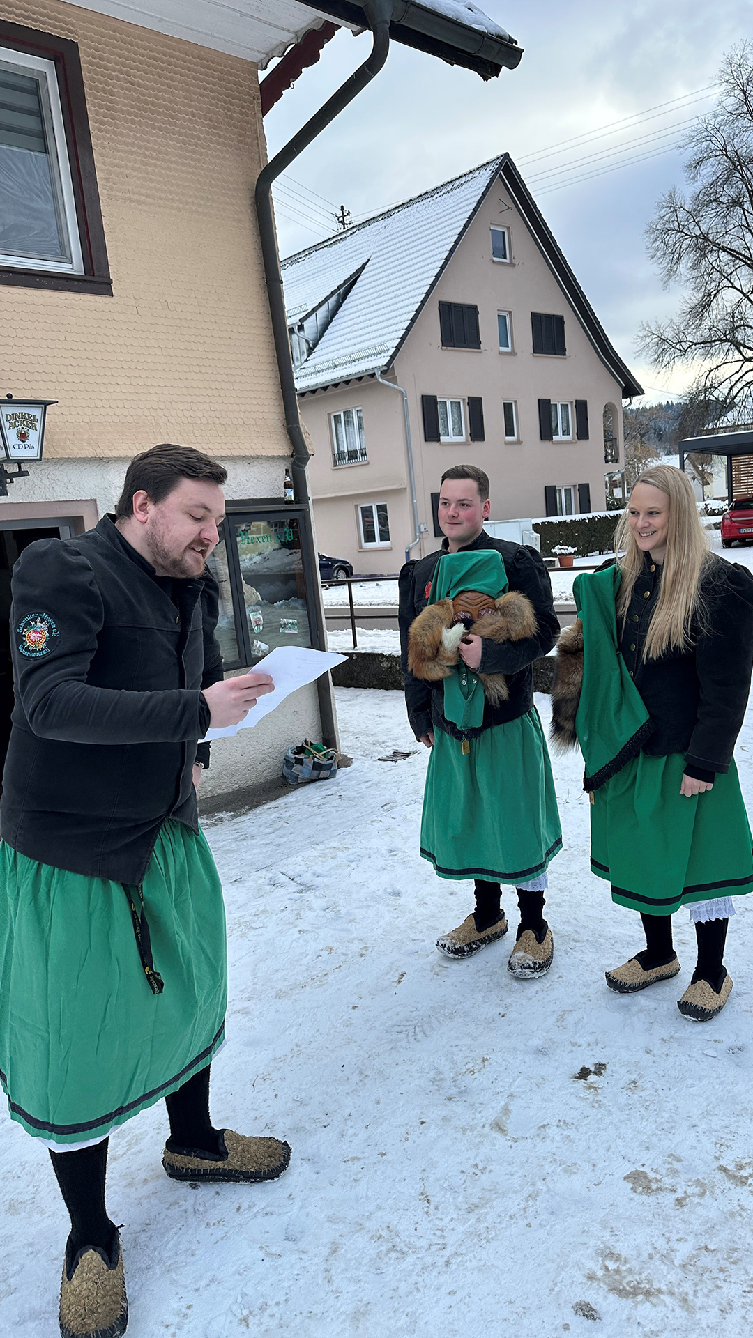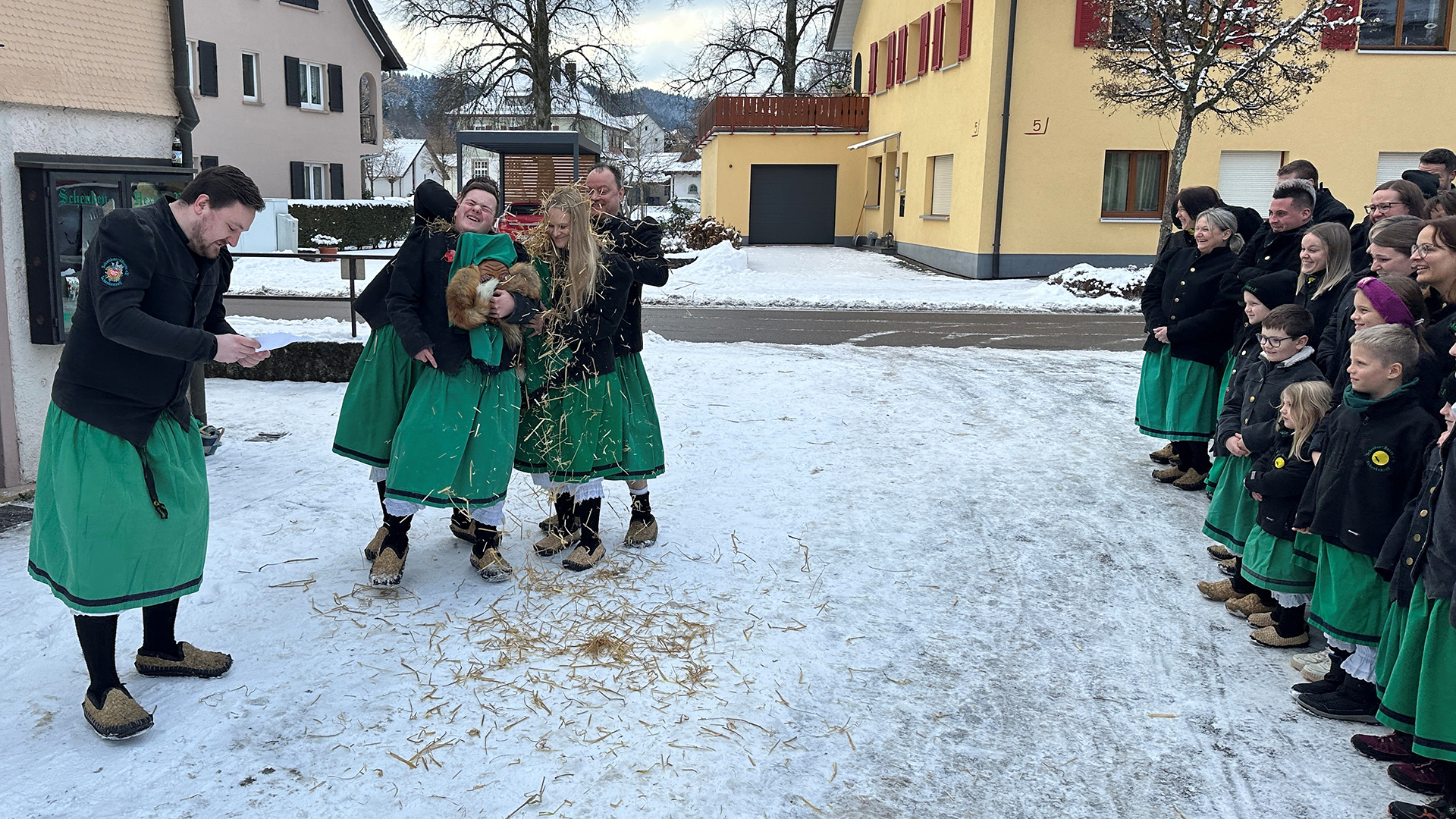 Im Mittelpunkt standen in diesem Jahr ein Neumitglied sowie ein Eigengewächs aus der Jugend: Sarah und Elias. Beiden wurde im Rahmen der Feierlichkeiten eine besondere Ehre zuteil. Nach alter Tradition wurden sie mit Stroh überzogen – ein symbolischer Akt, der den Beginn ihrer persönlichen Fasnet-„Karriere“ markiert. Wie es der Brauch verlangt, durften auch ein kräftiger Schnaps nicht fehlen, bevor die beiden offiziell in die Reihen der Schenken-Hexen e.V. aufgenommen wurden.